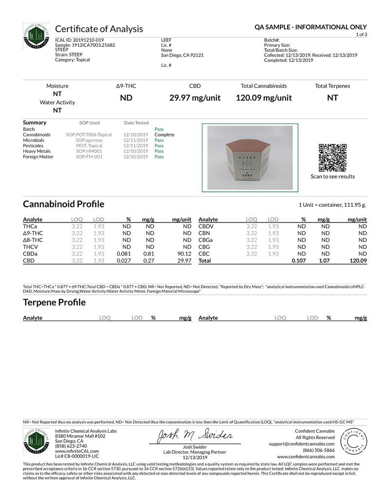 Lavandula Angustifolia (Lavender), Rosa Damascena (Moroccan Rose) Absolute, Jasminum Sambac (Jasmine) Absolute, Boswellia Serrata Extract, Natural Epsom Salt (Magnesium Sulfate), Himalayan Sea Salt, Whole Plant CBD (Hemp)