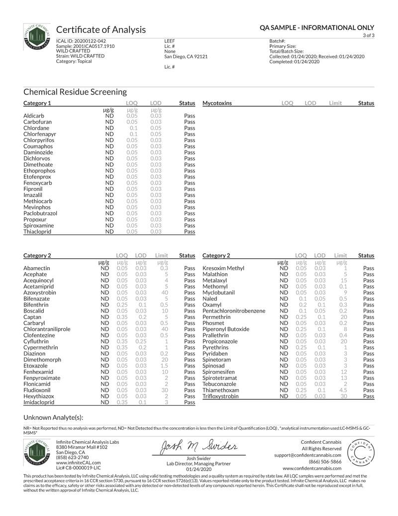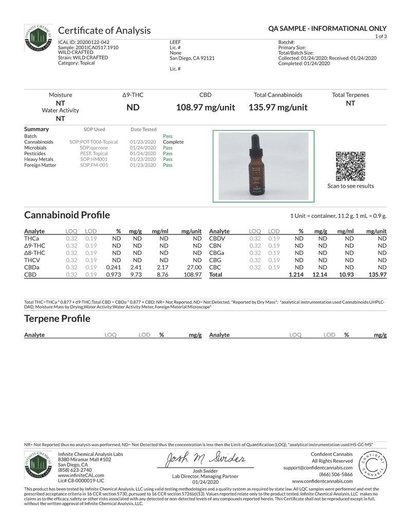 Moluccana (Kukui) Nut Oil, Simmondsia Chinensis (Jojoba) Seed Oil, Capric Triglycerides (Fractionated Coconut Oil), Lavandula Angustifolia (Lavender), Calendula Officinalis Flower Extract, Symphytum Officinale (Comfrey), Tocopherol (Vitamin E), Tanacetum annuum (Blue Tansy) Leaf Oil, Jasminum Sambac (Jasmine) Absolute, Rosa Damascena (Moroccan Rose) Absolute, Organic Whole Plant CBD Extract